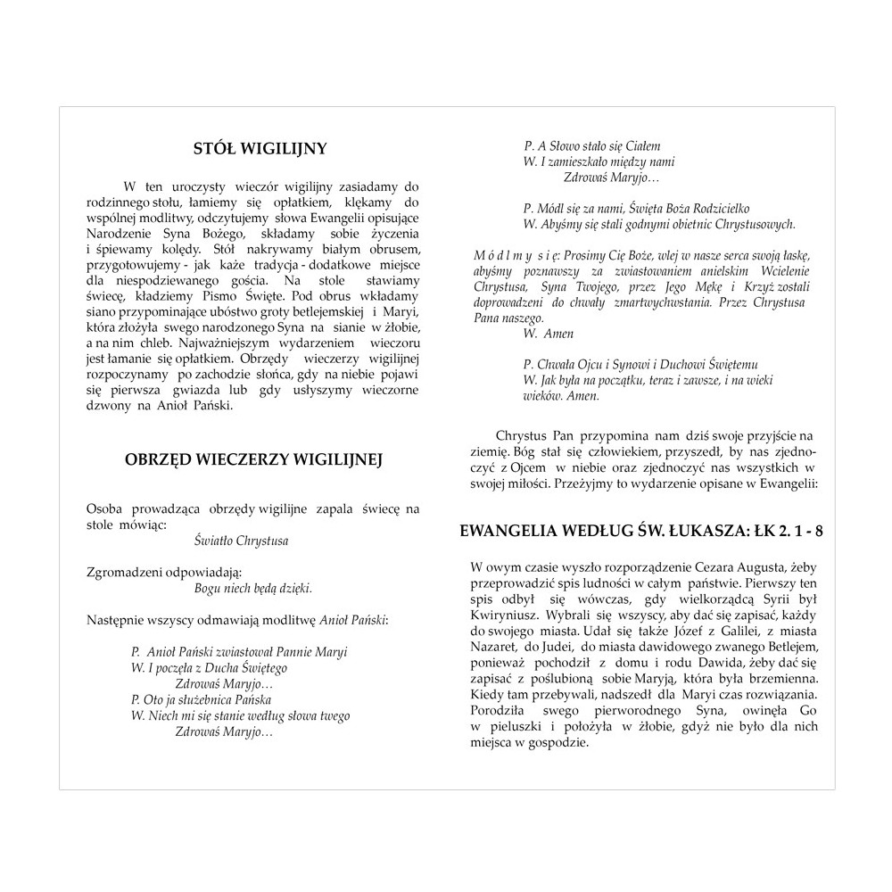 100 KOMPLETÓW. Jeden komplet opłatków wigilijnych składa się z trzech dużych opłatków (format 10 x 18 cm) oraz dwóch małych opłatków (format 6 x 10 cm), zapakowanych w eleganckiej kopercie z bożonarodzeniowym nadrukiem oraz folijce. Dodatkowo dodany jest Rytuał Wieczerzy Wigilijnej w polskiej rodzinie.