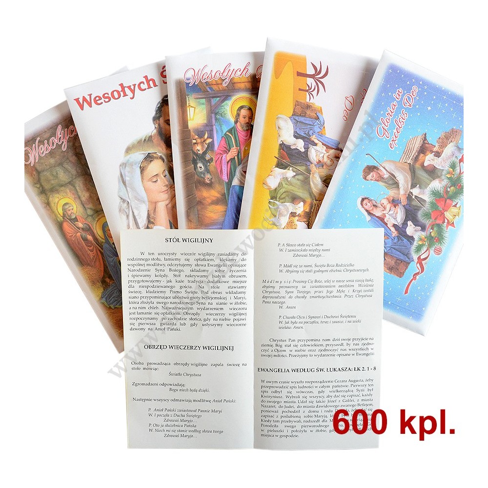 600 KOMPLETÓW. Jeden komplet opłatków wigilijnych składa się z trzech dużych opłatków (format 10 x 18 cm) oraz dwóch małych opłatków (format 6 x 10 cm), zapakowanych w eleganckiej kopercie z bożonarodzeniowym nadrukiem oraz folijce. Dodatkowo dodany jest Rytuał Wieczerzy Wigilijnej w polskiej rodzinie.