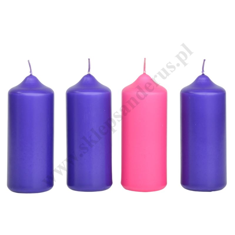 Komplet czterech świec prafinowych, spalanych do wieńca adwentowego o wysokości 11 cm i średnicy 4.8 cm.