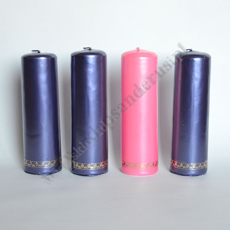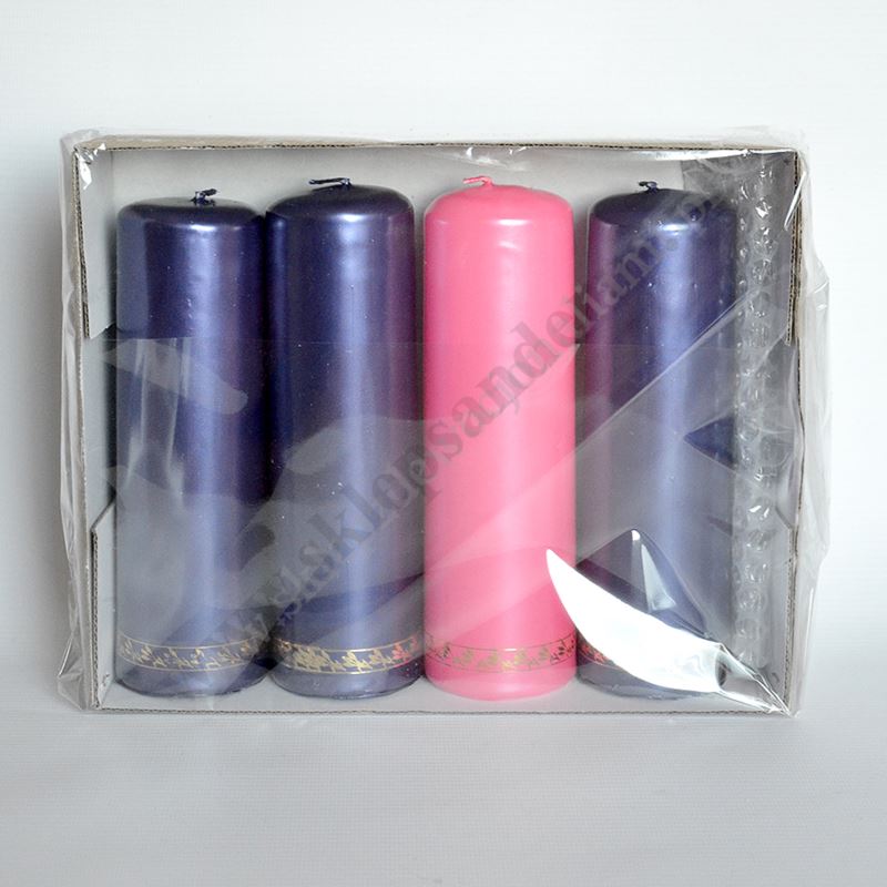 Komplet czterech świec prafinowych, spalanych do wieńca adwentowego o wysokości 18 cm i średnicy 6 cm.