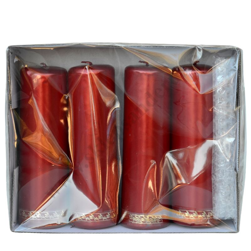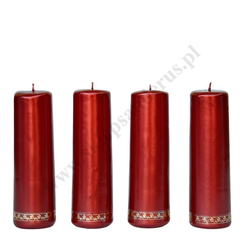 Komplet czterech świec prafinowych, spalanych do wieńca adwentowego o wysokości 18 cm i średnicy 6 cm.
