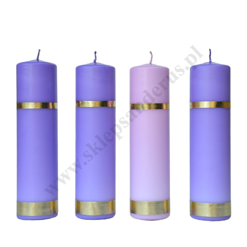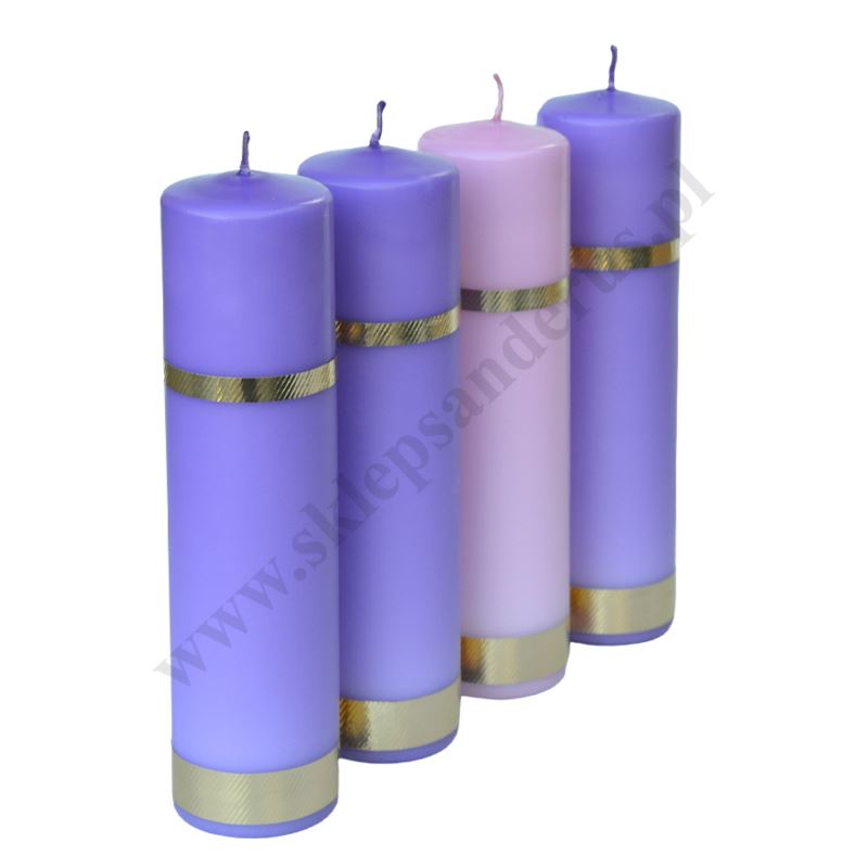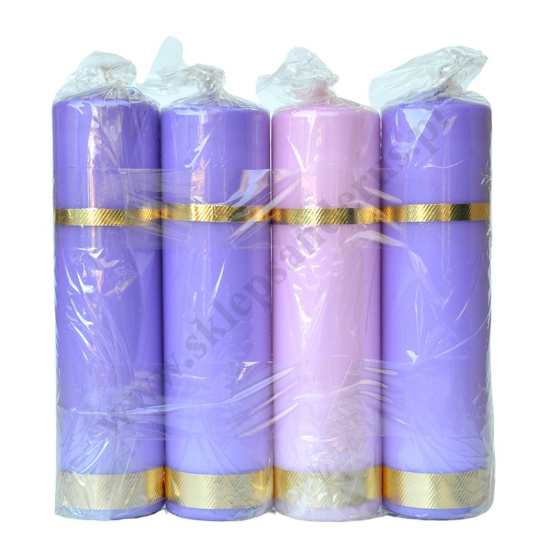Komplet świec do wieńca adwentowego składający się z trzech świec fioletowych i jednej różowej o wysokości 25 cm i średnicy 6.5 cm.