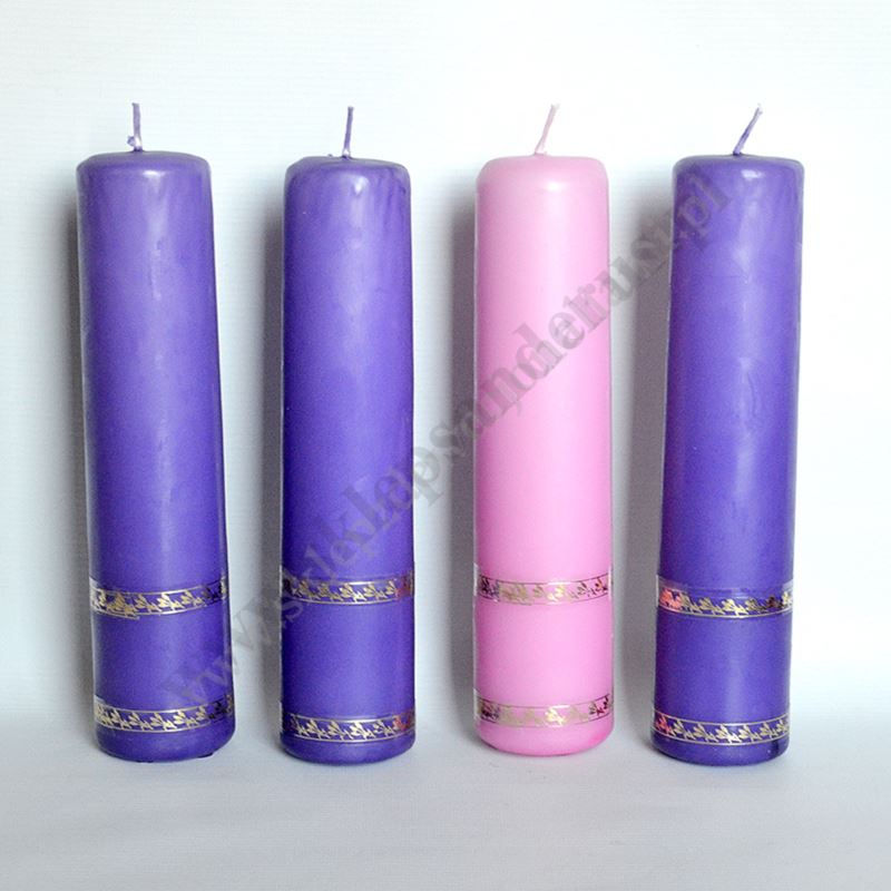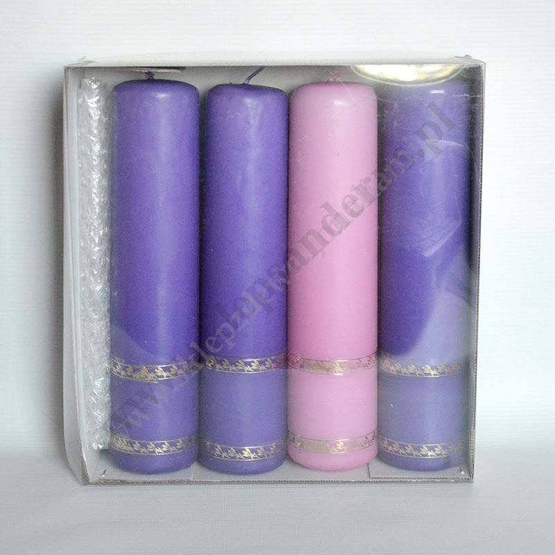 Komplet czterech świec prafinowych, spalanych do wieńca adwentowego o wysokości 25 cm i średnicy 6 cm.