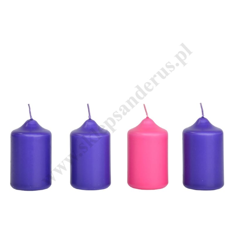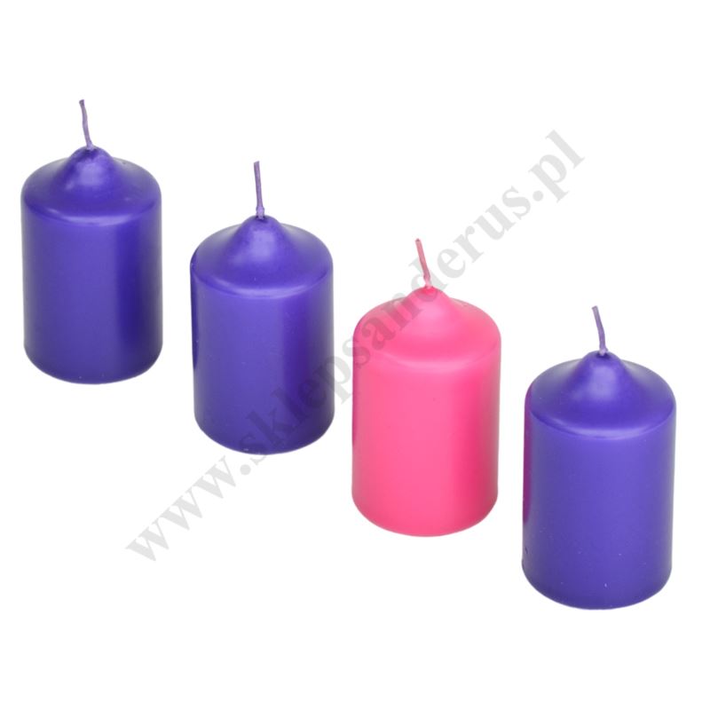 Komplet czterech świec prafinowych, spalanych do wieńca adwentowego o wysokości 6.5 cm i średnicy 4.5 cm.