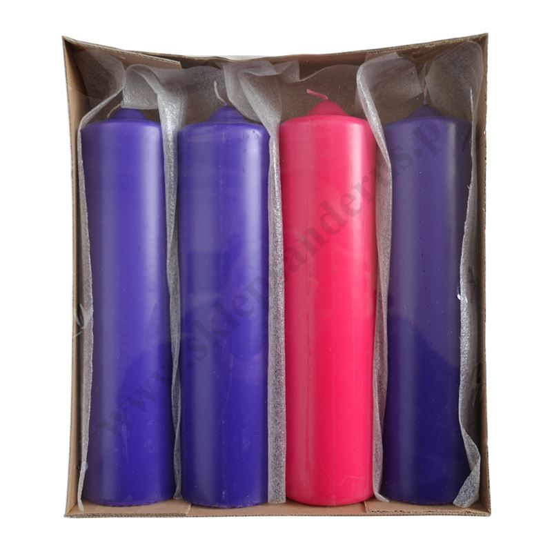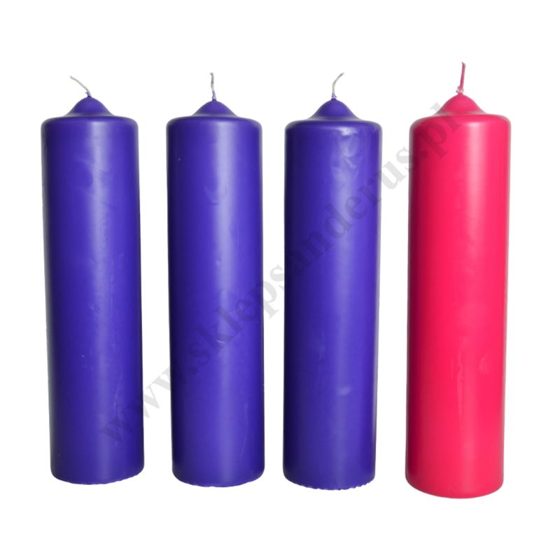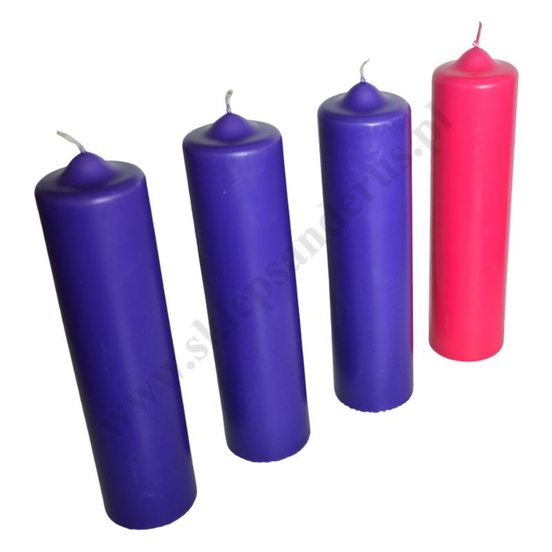 Komplet czterech świec do wieńca adwentowego o wysokości 24 cm i średnicy 6.5 cm.