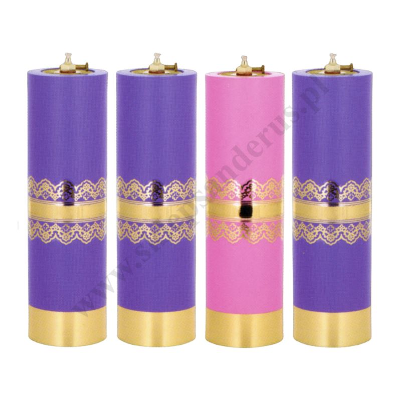 Komplet świec adwentowych w skład którego wchodzą: 3 fioletowe świece i 1 różowa świeca. Świece są wykonane z bardzo trwałego tworzywa z regulowanym wkładem olejowym o pojemności 180 ml. Wysokość świecy 31 cm , średnica świecy 90 mm.