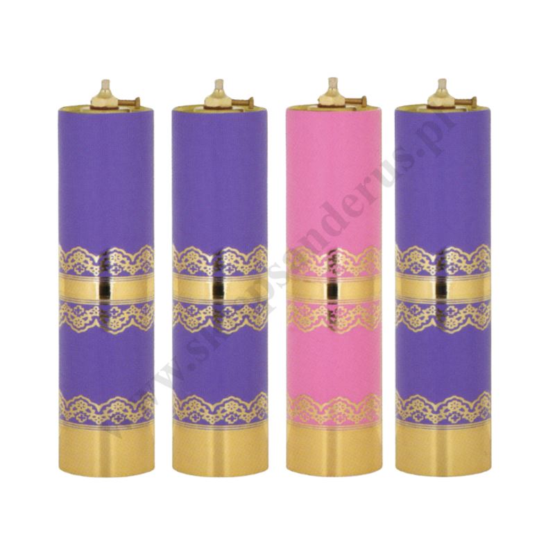 Komplet świec adwentowych w skład którego wchodzą: 3 fioletowe świece i 1 różowa świeca. Świece są wykonane z bardzo trwałego tworzywa z regulowanym wkładem olejowym o pojemności 180 ml. Wysokość świecy 31 cm , średnica świecy 75 mm.