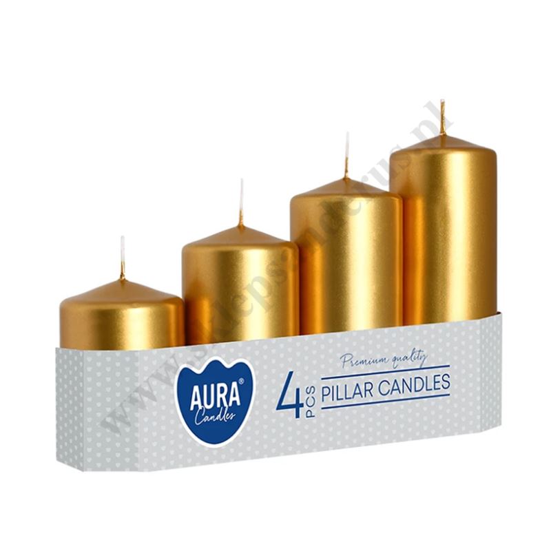 Świece wotywne schodkowane mają kształt walca, który stopniowo zwęża się w miarę wzrostu wysokości. Dzięki temu wyglądają one bardzo efektownie i elegancko. Zestaw ten zawiera 4 sztuki świec w odcieniu złotego metaliku, co dodaje im wyjątkowego blasku.