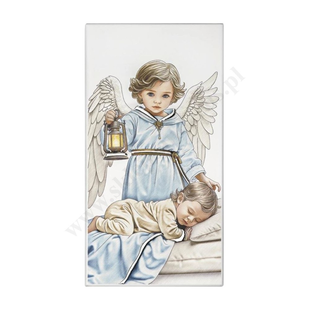 Obrazek w wymiarze 12 x 24 cm przedstawiający Anioła Stróża czuwającego nad śpiącym dzieckiem, który został zaprojektowany oraz wyprodukowany we Włoszech zgodnie z najwyższymi standardami włoskiego rzemiosła.