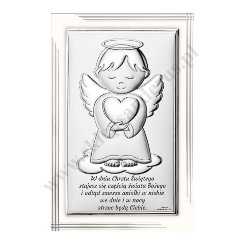 Srebrny obrazek na stylizowanej desce, przedstawiający Anioła Stróża z sercem ze specjalną dedykacją na Chrzest Święty. Rozmiar obrazka 11.5 x 17.5 cm.
