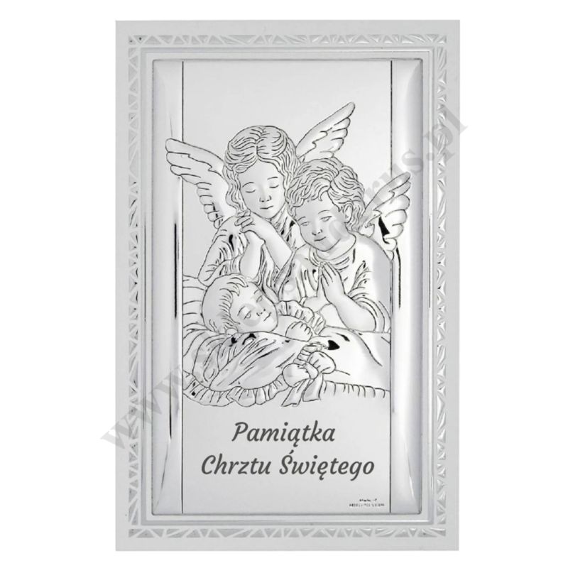 Srebrny obrazek przedstawiający Anioły czuwające nad śpiącym dzieckiem. Rozmiar obrazka 11.5 x 17.5 cm. PONIŻEJ W PRODUKTACH POWIĄZANYCH ISTNIEJE MOŻLIWOŚĆ ZAMÓWIENIA OKAZJONALNEJ DEDYKACJI NA TABLICZCE LUB REWERSIE OBRAZKA.