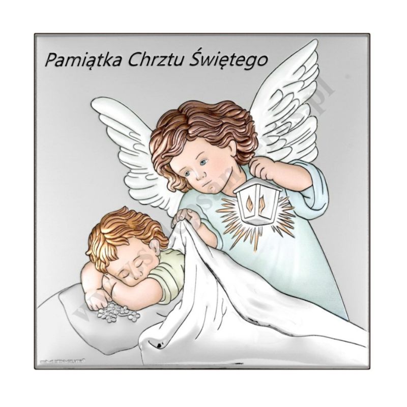Srebrny obrazek koloryzowany przedstawiający anioła stróża z latarenką czuwająceg nad śpiącym dzieckiem. Rozmiar obrazka 12 x 12 cm. PONIŻEJ W PRODUKTACH POWIĄZANYCH ISTNIEJE MOŻLIWOŚĆ ZAMÓWIENIA OKAZJONALNEJ DEDYKACJI NA TABLICZCE LUB REWERSIE OBRAZKA.