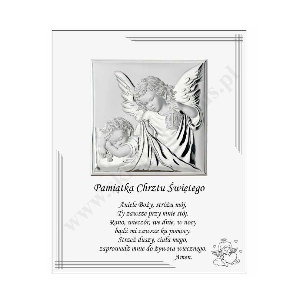 Srebrny obrazek przedstawiający Anioła czuwającego nad śpiącym dzieckiem, umieszczony na białej stylizowanej desce z tekstem modlitwy do Anioła Stróża. Rozmiar obrazka 20 x 25 cm.