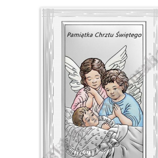Srebrny obrazek, koloryzowany przedstawiający Anioły czuwające nad śpiącym dzieckiem. Rozmiar obrazka 10 x 16 cm. PONIŻEJ W PRODUKTACH POWIĄZANYCH ISTNIEJE MOŻLIWOŚĆ ZAMÓWIENIA OKAZJONALNEJ DEDYKACJI NA TABLICZCE LUB REWERSIE OBRAZKA.