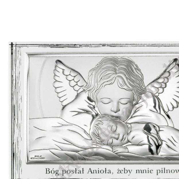 Srebrny obrazek z wizerunkiem Anioła Stróża na białym drewnie z podpisem. Obrazek jest z możliwością postawienia lub powieszenia. Szerokość obrazka 17.5 cm, wysokość obrazka 11.5 cm.
