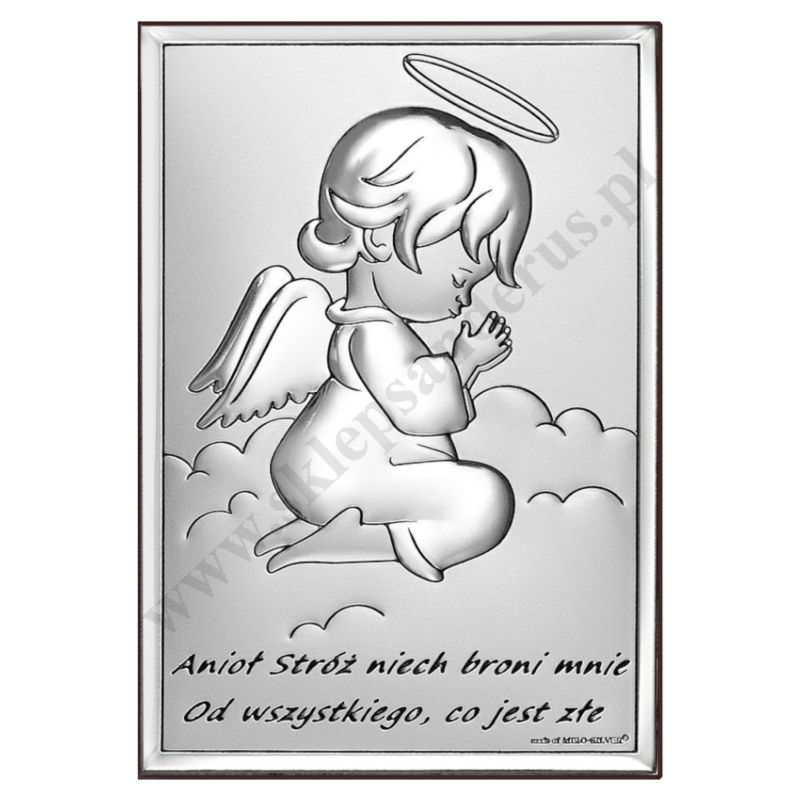 Srebrny obrazek przedstawiający anioła stróża modlącego się. Rozmiar obrazka 9 x 13 cm. PONIŻEJ W PRODUKTACH POWIĄZANYCH ISTNIEJE MOŻLIWOŚĆ ZAMÓWIENIA OKAZJONALNEJ DEDYKACJI NA TABLICZCE LUB REWERSIE OBRAZKA.