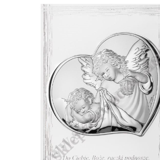 Srebrny obrazek na białym, zdobionym drewnie przedstawiający Anioła Stróża z okazjonalnym tekstem. Rozmiar obrazka 11.5 x 17.5 cm. PONIŻEJ W PRODUKTACH POWIĄZANYCH ISTNIEJE MOŻLIWOŚĆ ZAMÓWIENIA OKAZJONALNEJ DEDYKACJI NA TABLICZCE SREBRNEJ LUB ZŁOTEJ.