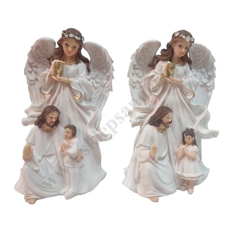 Figurka aniołka komunijnego z Panem Jezusem i chłopcem lub dziewczynką. Figurka wykonana z z polyresinu (mieszanka żywicy, mączek alabastrowych i ceramicznych). Wysokość figurki 20 cm. Sprzedaż w miksie wzorów.