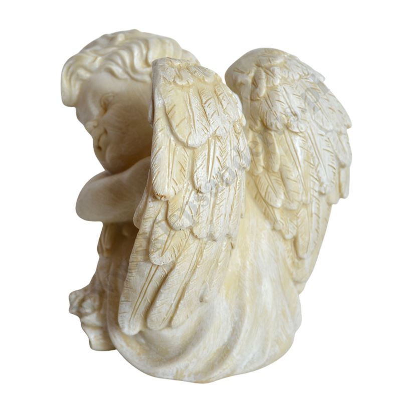 Figurka aniołka wykonana z żywicy o wysokości 16.8 cm, szerokości 15.5 cm i głębokości 13.5 cm.