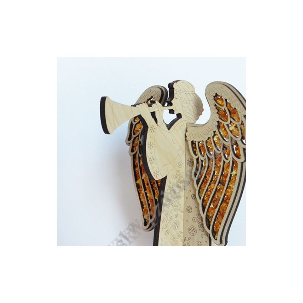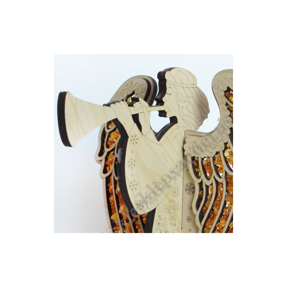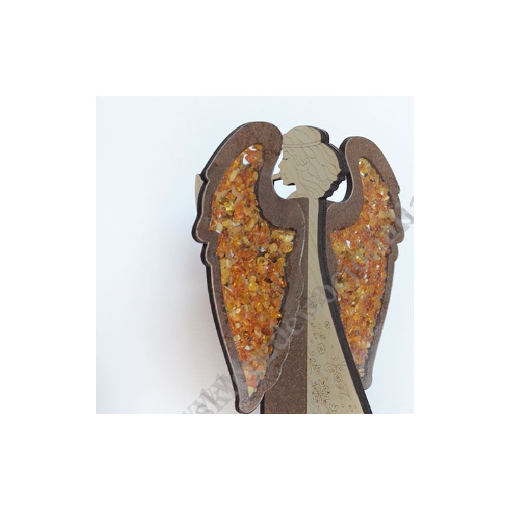 Figurka anioła wykonana z płyty mdf, w skrzydłach anioła umieszczone są bursztyny. Wysokość anioła 13 cm, szerokość 11 cm, głębokość 10 cm.