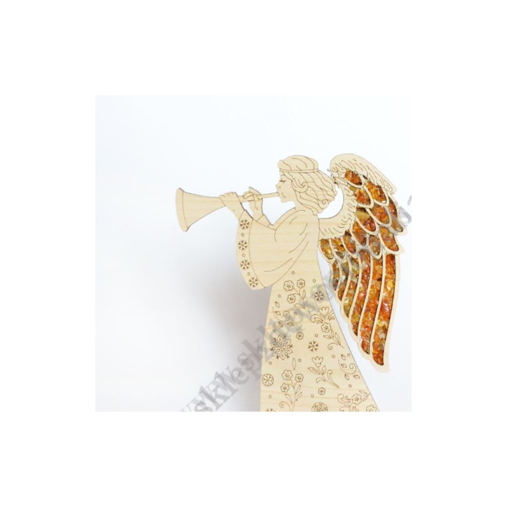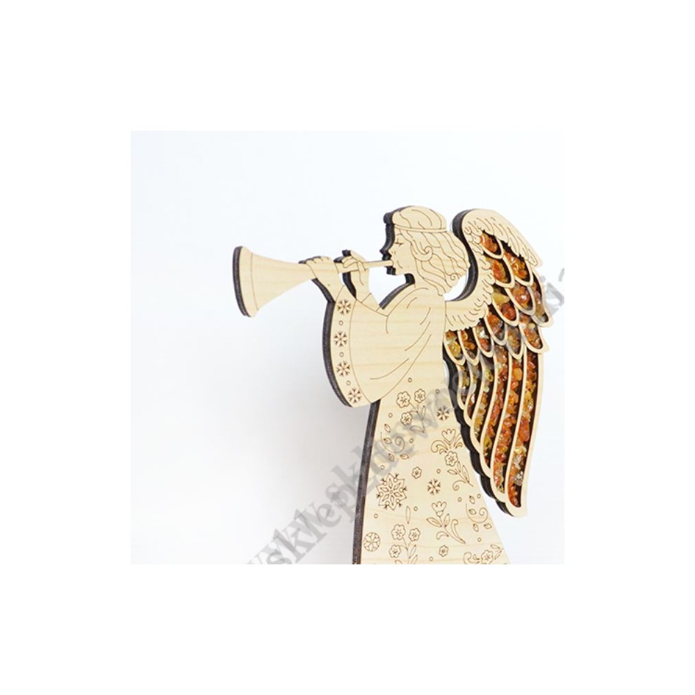 Figurka anioła wykonana z płyty mdf, w skrzydłach anioła umieszczone są bursztyny. Wysokość anioła 14 cm, szerokość 11 cm.