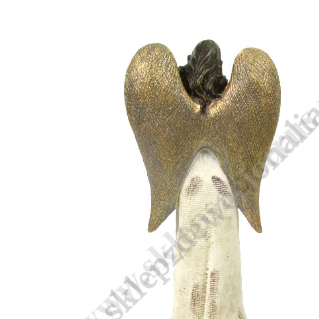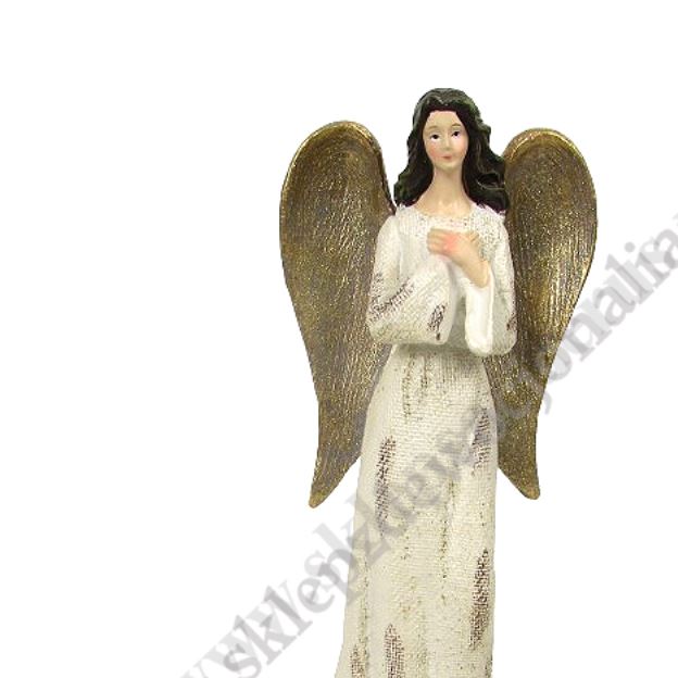 Anioł modlący się w kolorze ecru złoto - brązowym wykonany z polyresin (mieszanka żywicy, mączek alabastrowych i ceramicznych), delikatnie posypany złotym brokatem.