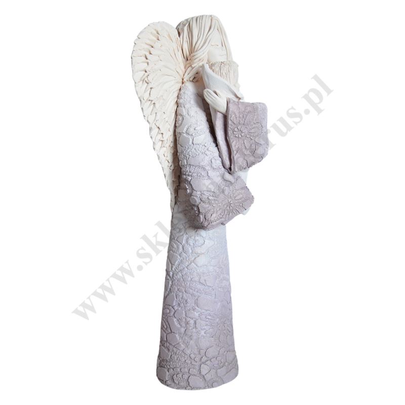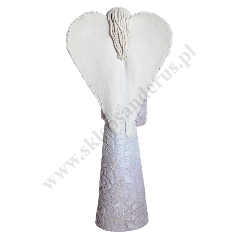 Anioł z dzieciątkiem wykonany z ceramiki glinianej o wysokości 30 cm, szerokości 14 cm i głębokości 9 cm.