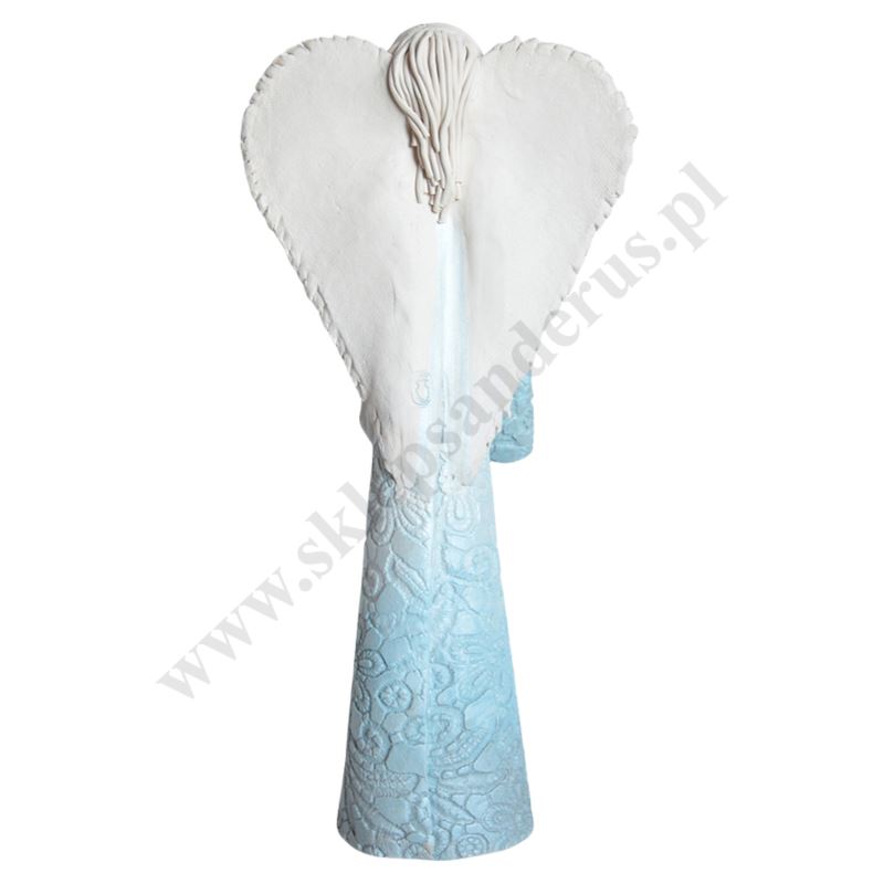 Anioł z dzieciątkiem wykonany z ceramiki glinianej o wysokości 30.5 cm, szerokości 14 cm i głębokości 9 cm.