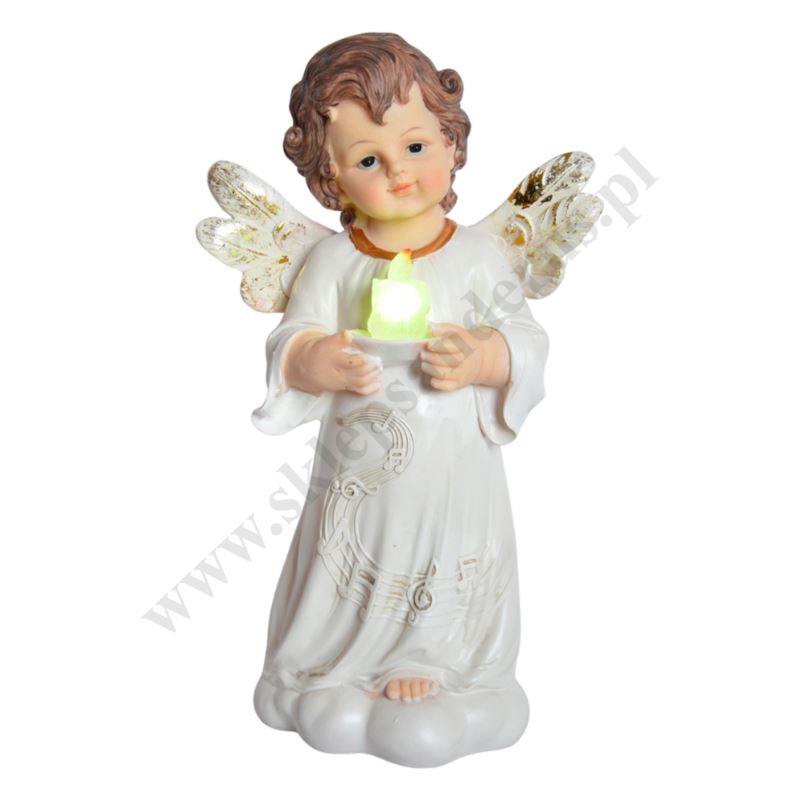 Figurka aniołka trzymającego świecącą latarenkę lub świecę, wykonana z żywicy o wysokości 30 cm, szerokości 17 cm i głębokości 10.5 cm. Laternka lub świeca świeci światłem zmieniajacym kolory. Baterie w zestawie. Sprzedaż w miksie wzorów.