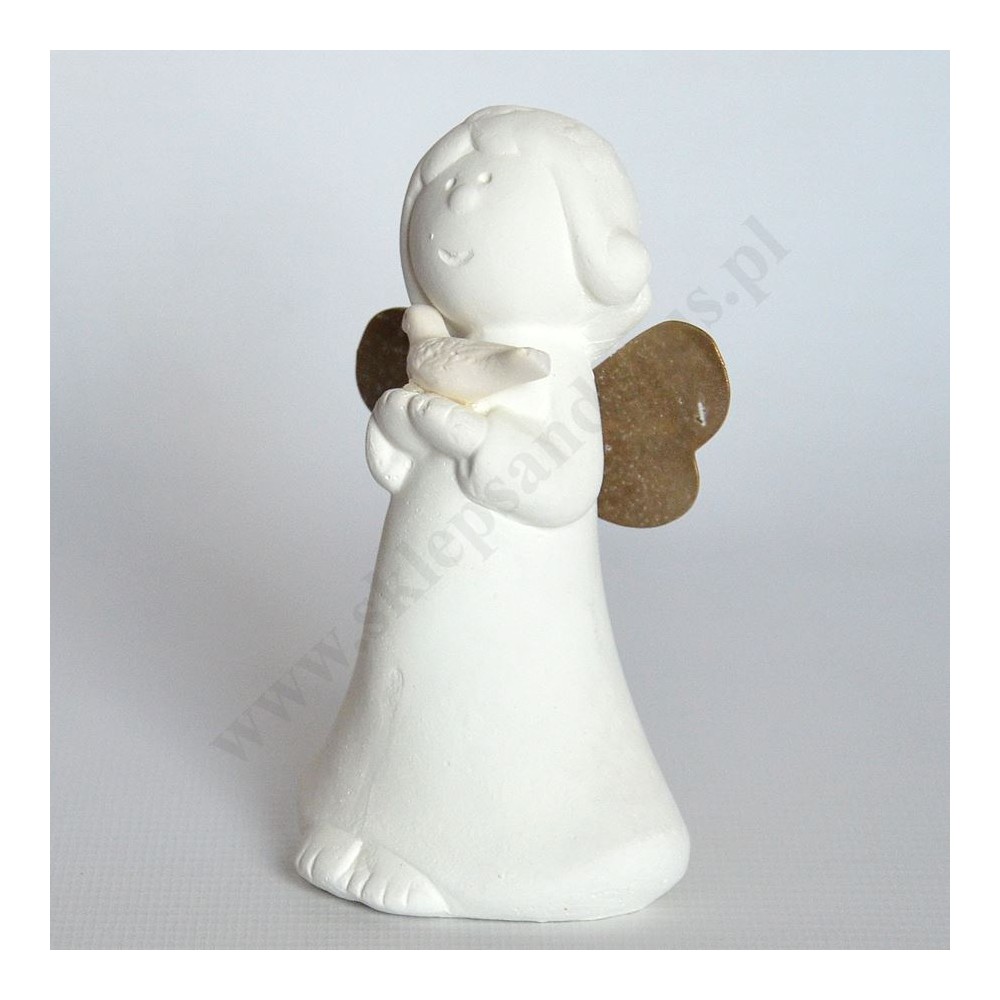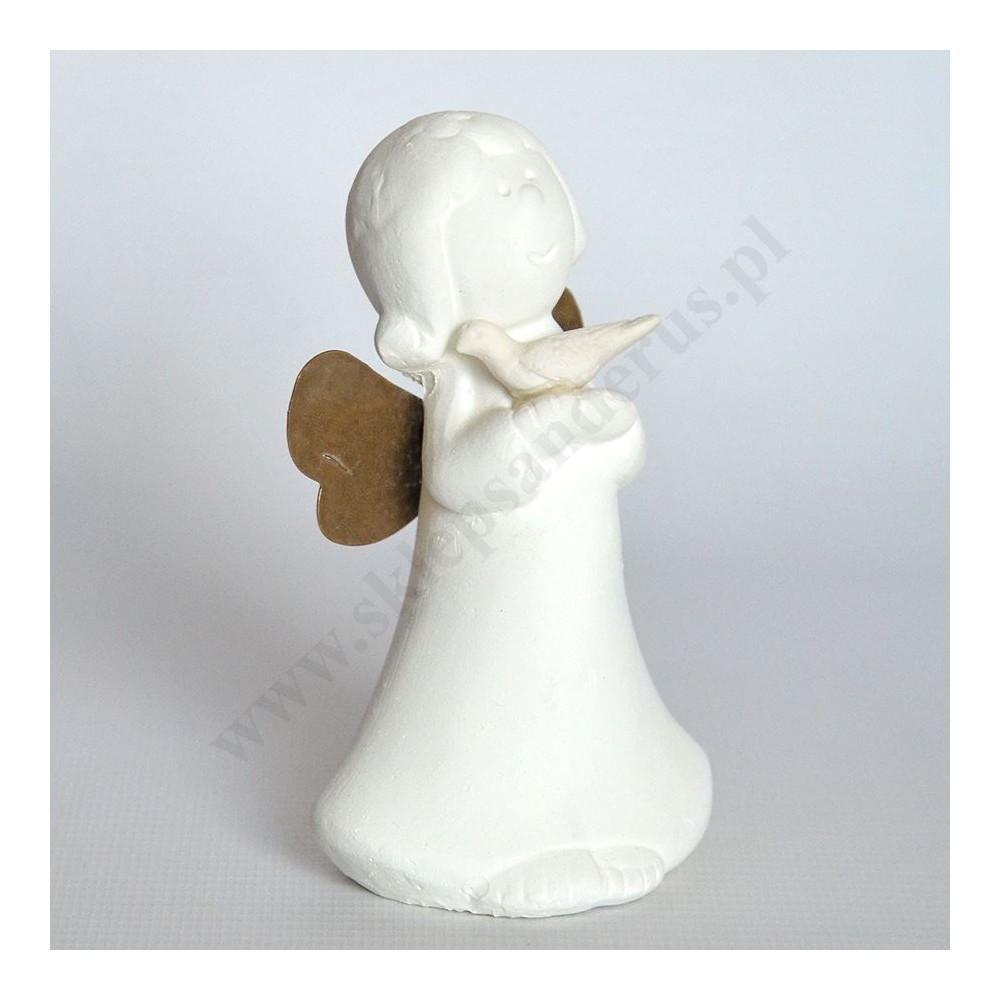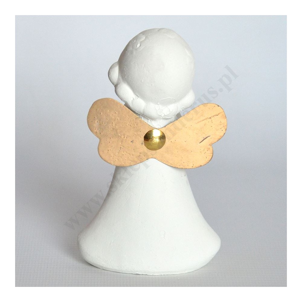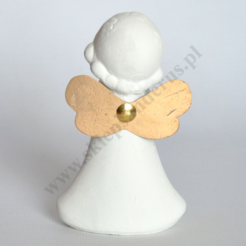 Figurka aniołka o wysokości 10.8 cm i szerokości 6.3 cm wykonana z gipsu.