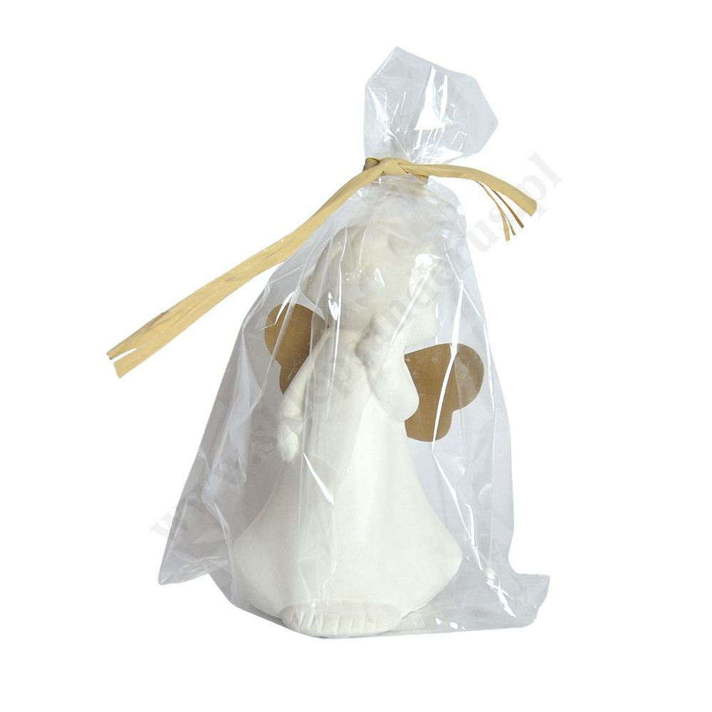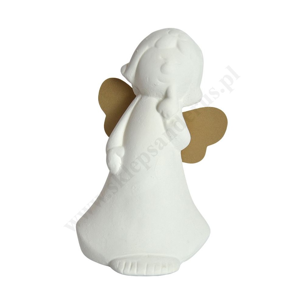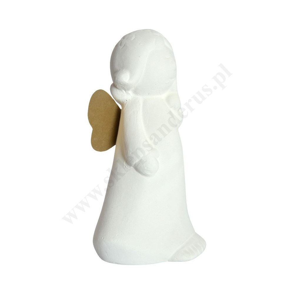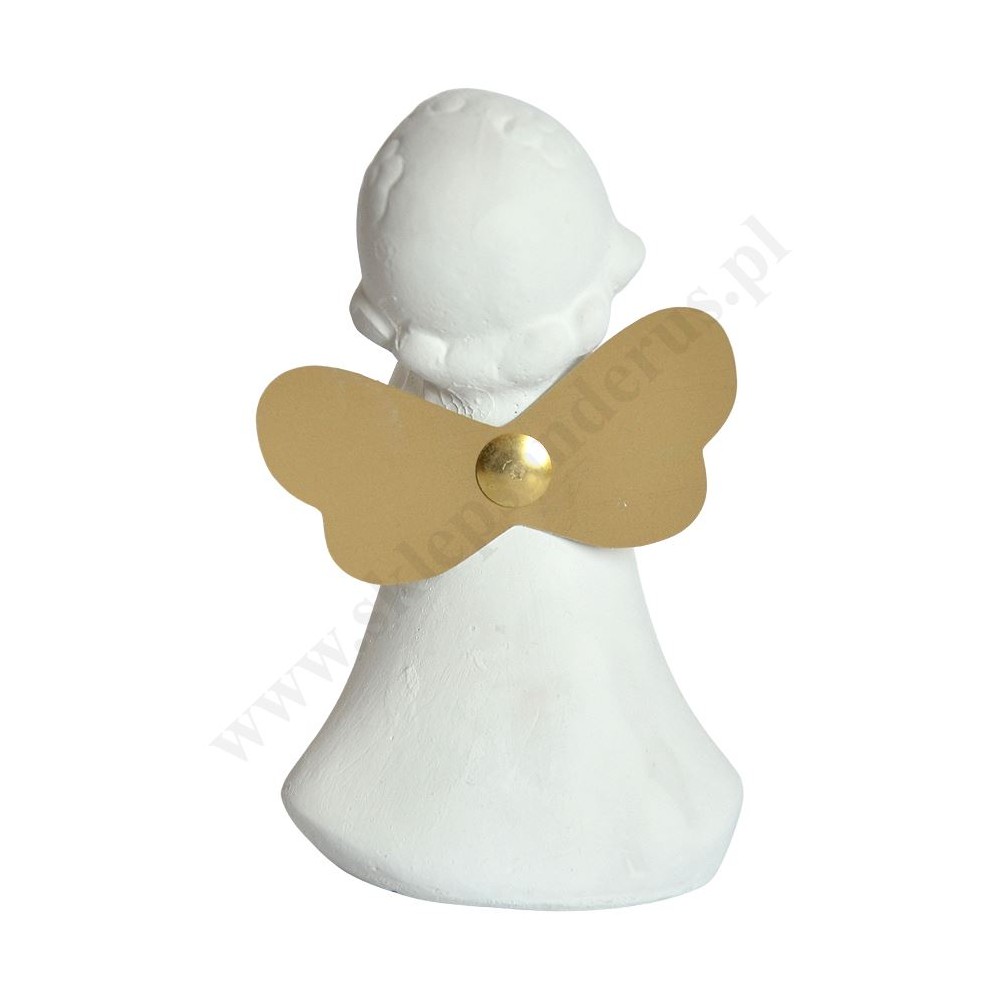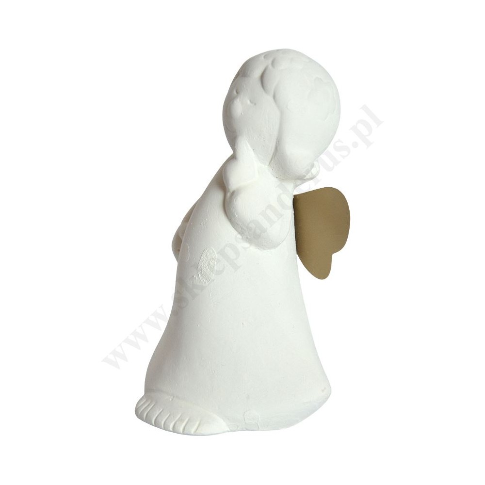 Figurka aniołka o wysokości 10.8 cm i szerokości 6 cm wykonana z gipsu.