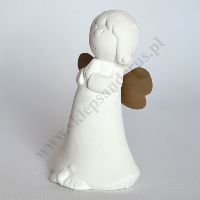 Figurka aniołka o wysokości 10.8 cm i szerokości 6.8 cm wykonana z gipsu.
