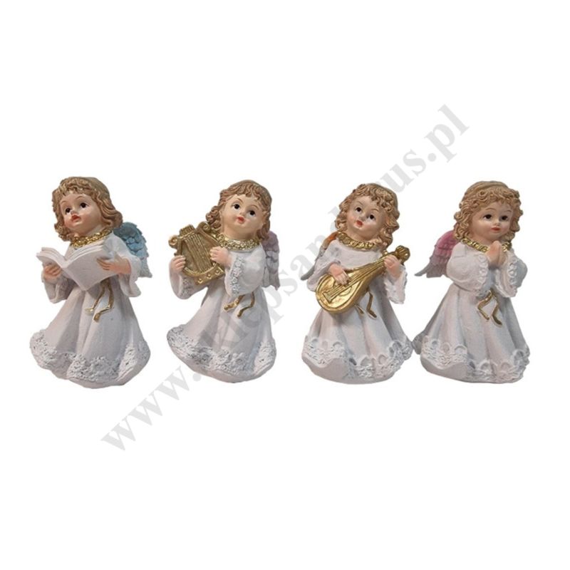 Figurka aniołka wykonana z polyresinu (mieszanka żywic, mączek alabastrowych i ceramicznych). Wysokość aniołka 12.5 cm. Sprzedaż w miksie wzorów.