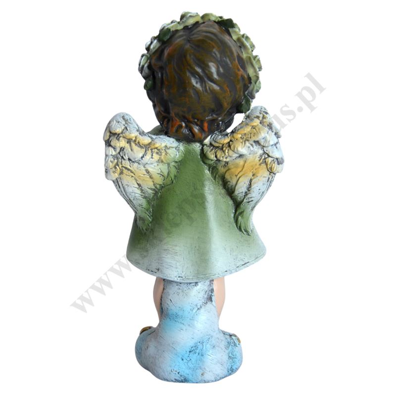 Figurka aniołka wykonana z żywicy o wysokości 16.5 cm i szerokości 8 cm.