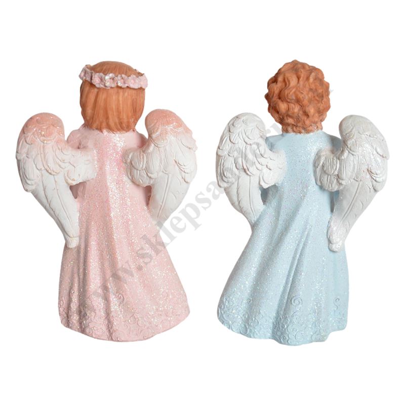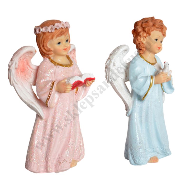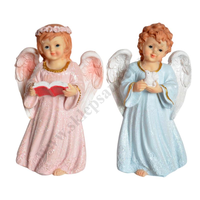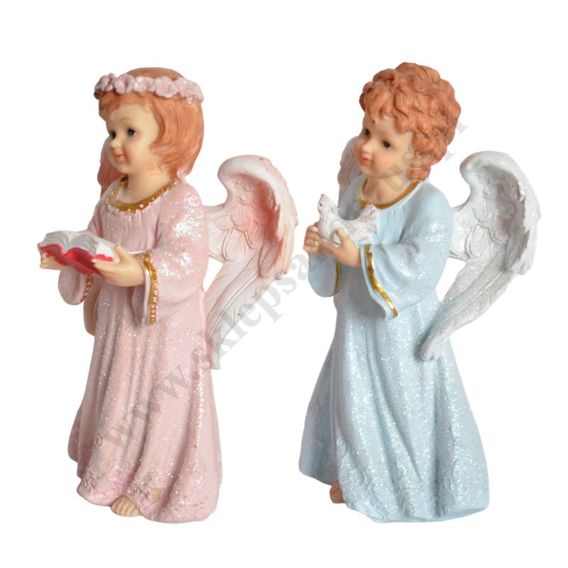 Figurka aniołka wykonana z żywicy o wysokości 21.5 cm, szerokości 13 cm i głębokości 9 cm. Sprzedaż w miksie wzorów.