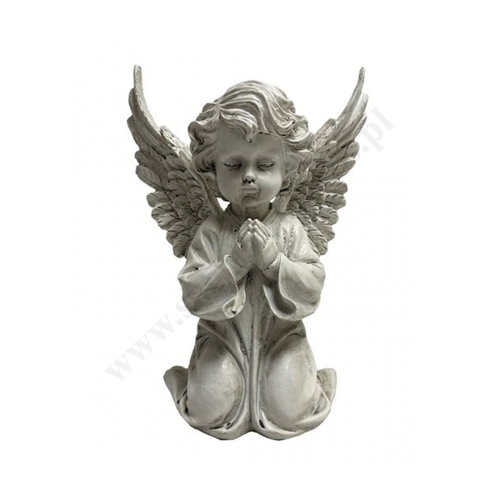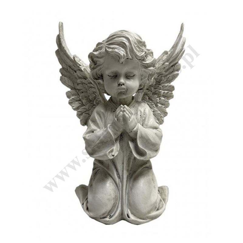 Figurka aniołka wykonana z żywicy o wysokości 25 cm i szerokości 19 cm.