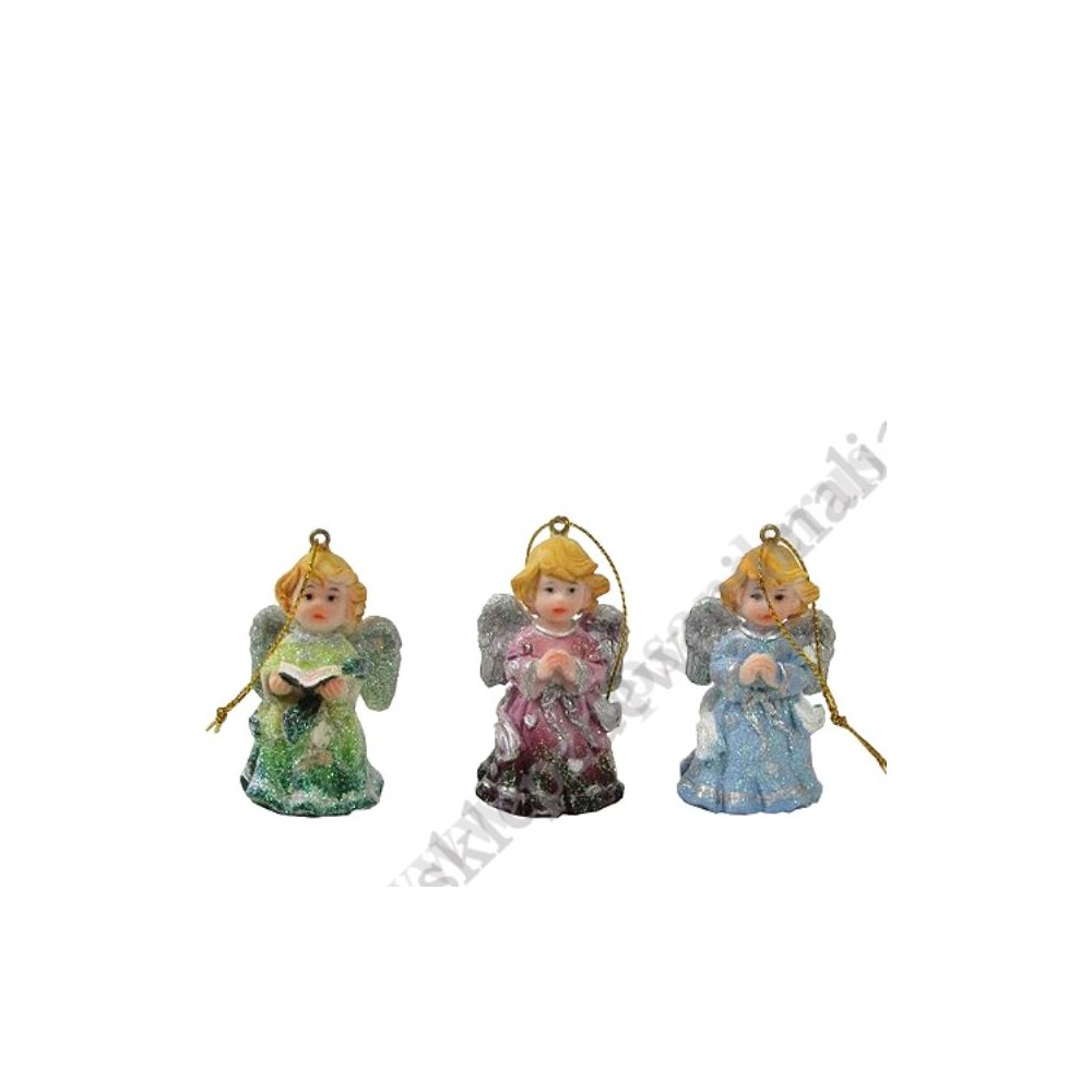 Figurka aniołka wykonana z tworzywa sztucznego o wysokości 6 cm z możliwością powieszenia na złotym sznureczku. Sprzedaż w miksie wzorów.