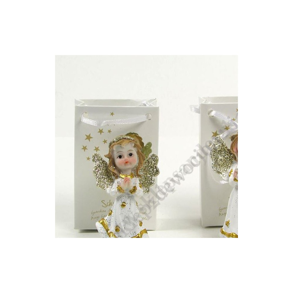 Figurka aniołka wykonana z tworzywa sztucznego zapakowana w elegancką mini torebkę papierową