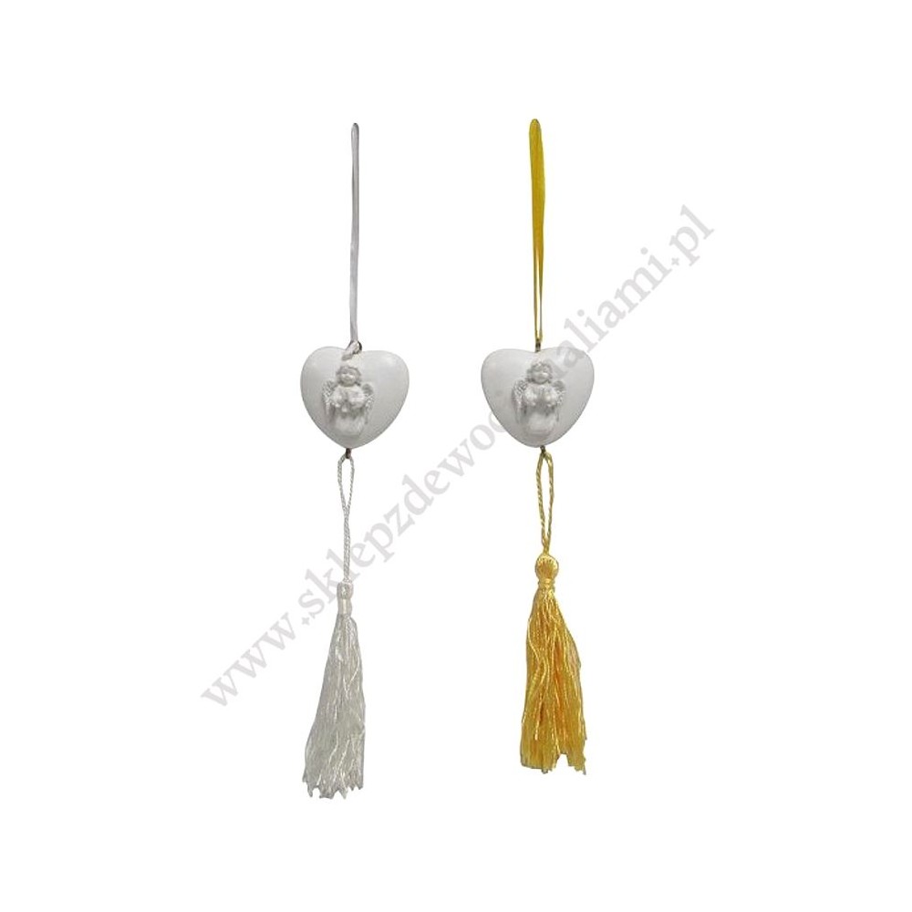 Aniołek na serduszku, zawieszka na choinkę o wysokości 28 cm, wykonana z żywicznej mieszanki. Sprzedaż w miksie kolorów.
