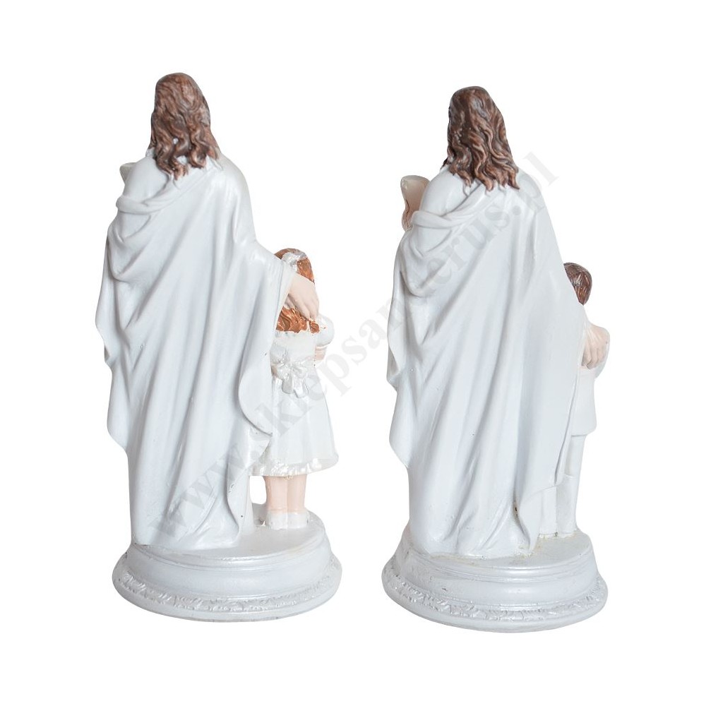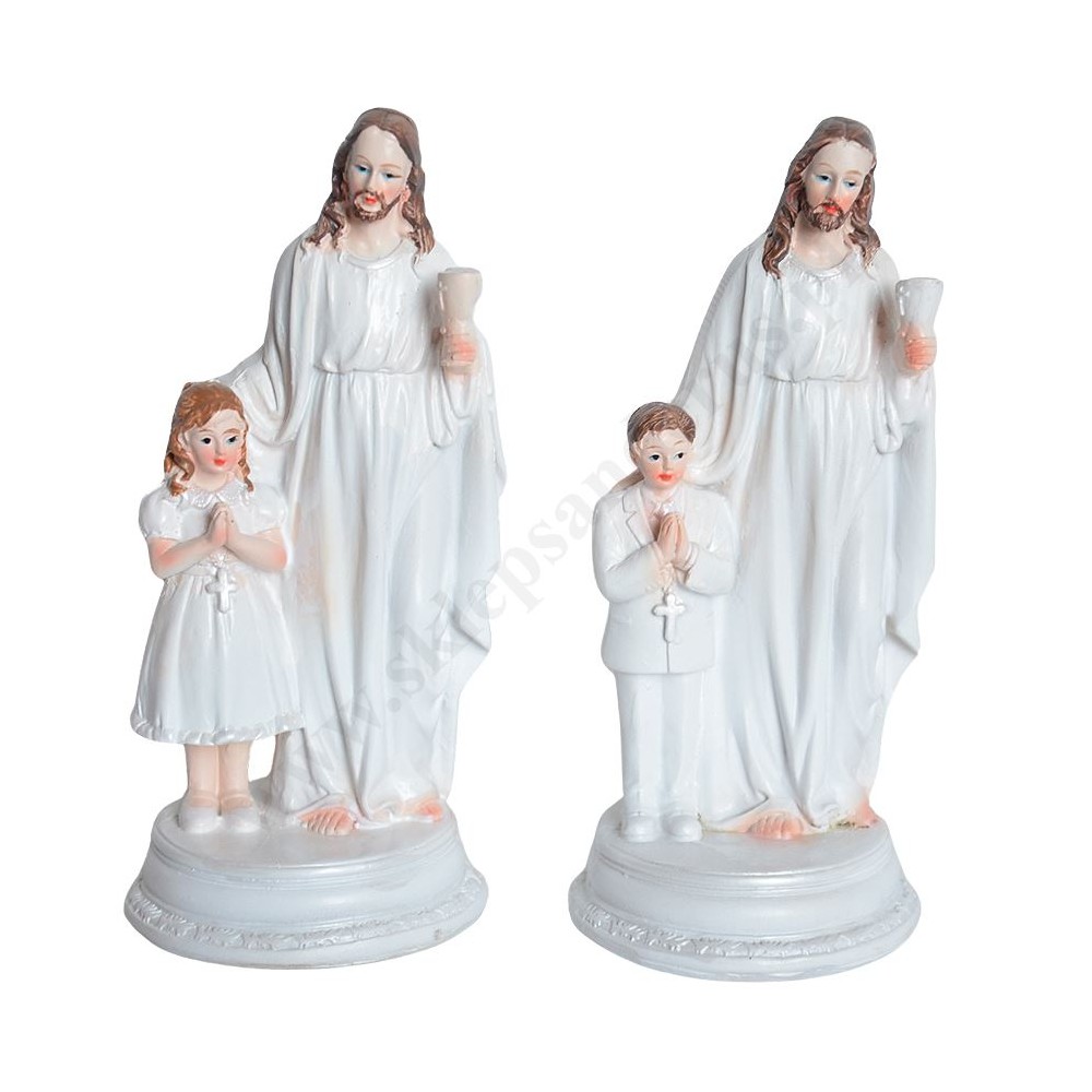 Figurka o wysokości 14 cm i szerokości 6.5 cm w podstawie, przedstawiająca Pana Jezusa z dziewczynką lub chłopcem przystępującym do I Komunii Świętej.