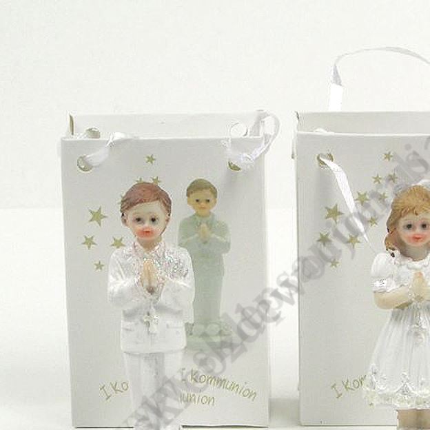 Figurki komunijne przedstawiające dziewczynkę i chłopca przyjmujących Pierwszą Komunię Świętą o wysokości 8 cm wykonanych z masy plastycznej. Każda figurka jest zapakowana w okazyjną papierową, lakierowaną torebkę. W komentarzu do zamówienia prosimy o informację jaka figurka jest zamawiana: chłopiec czy dziewczynka. W przypadku braku takiej informacji figurka zostanie wybrana losowo.