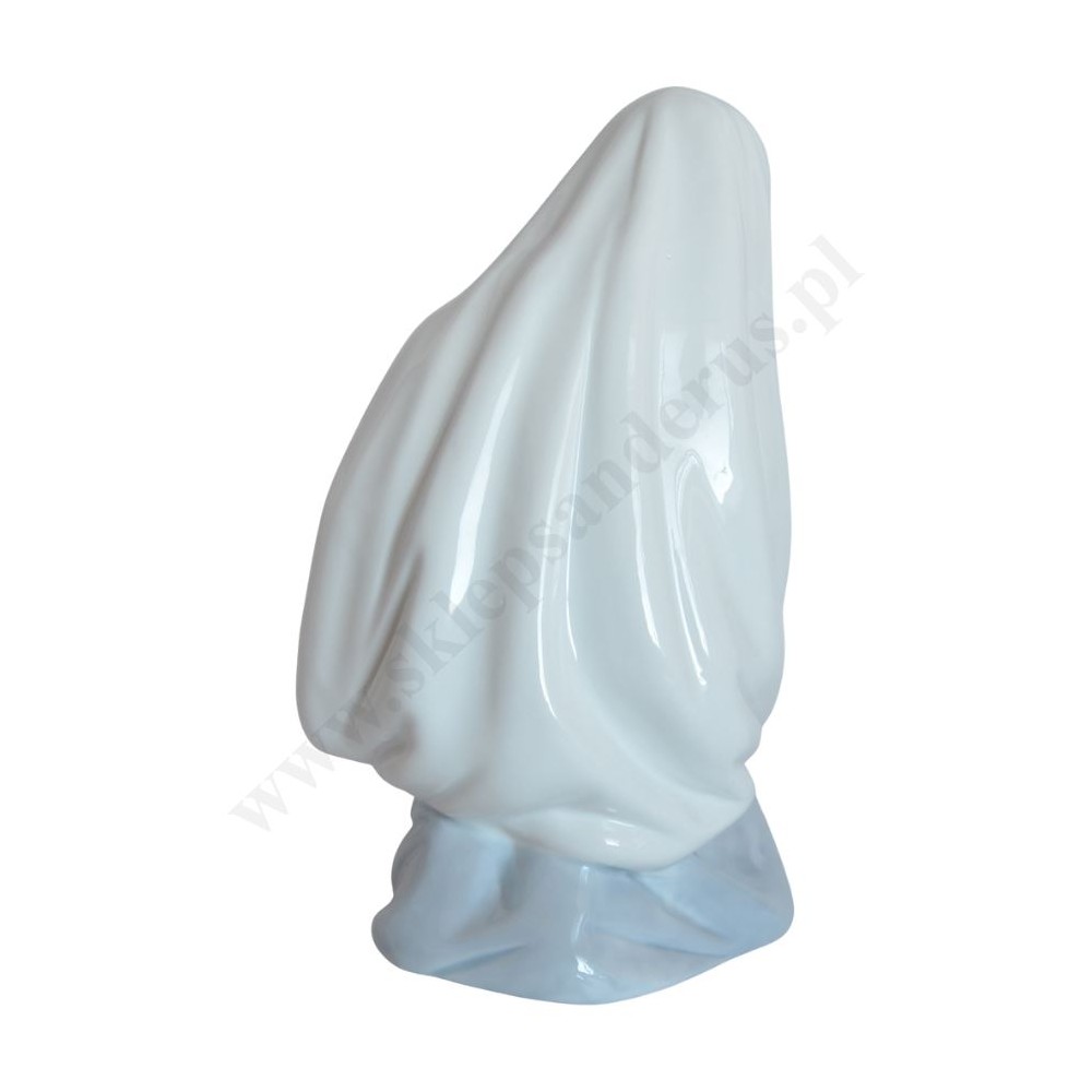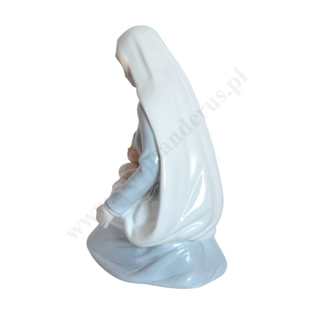 Porcelanowa figurka Matki Bożej z Dzieciątkiem o wysokości 19.5 cm, szerokości 11.5 cm i głębokości 10 cm.