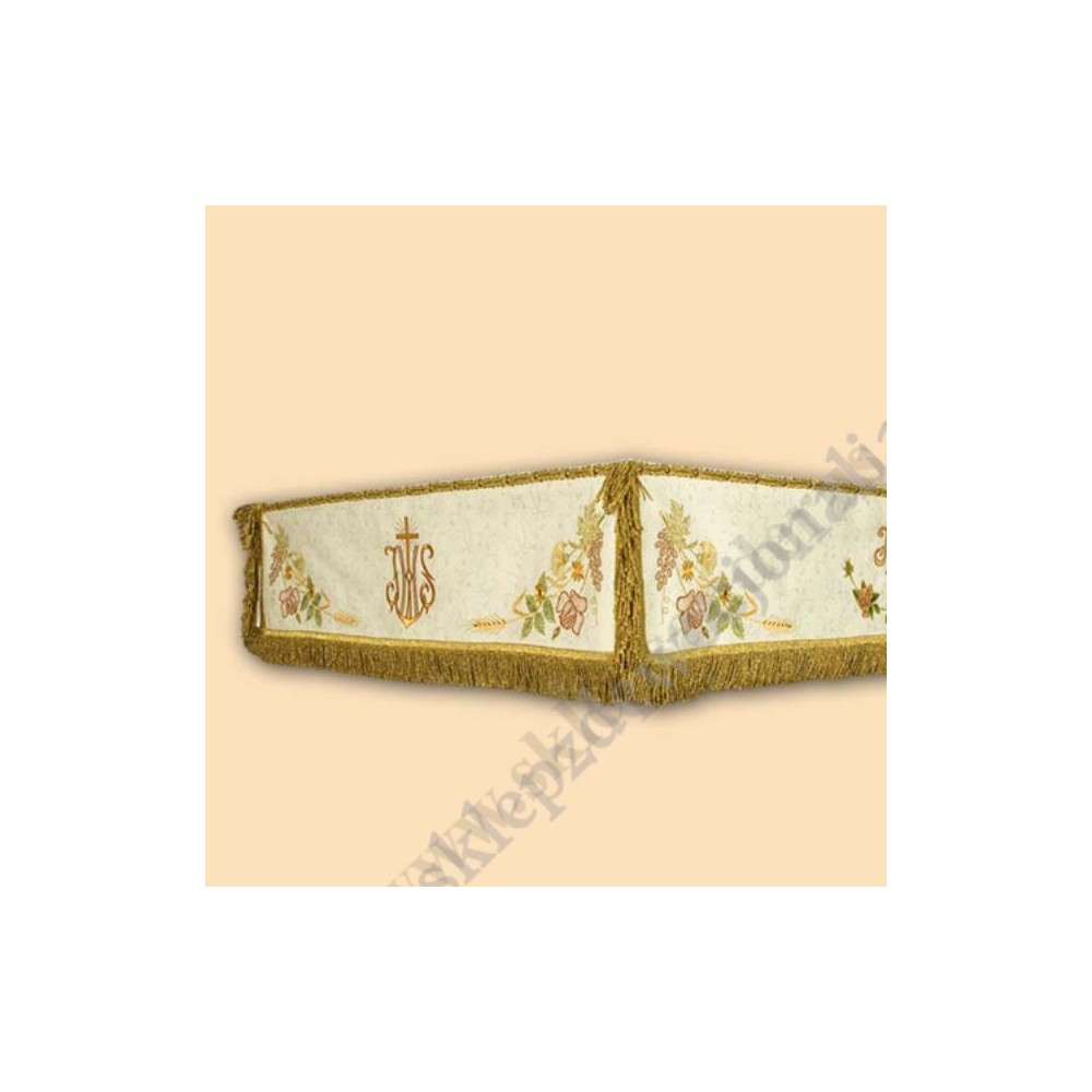 Baldachim o wymiarach 140 cm x 170 cm, zdobiony haftami eucharystycznymi. Baldachim bez klamr i drzewców.