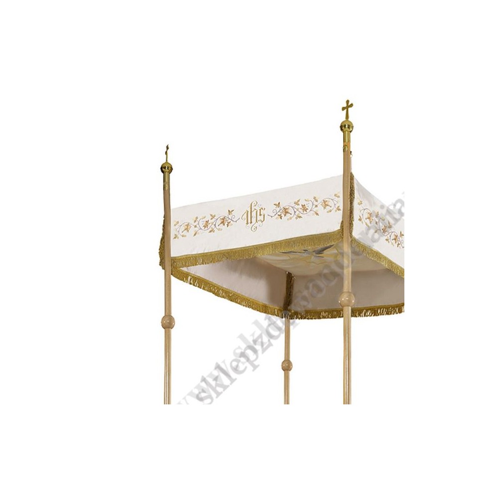 Baldachim liturgiczny w wymiarze 130 cm x 160 cm wykonany z wysokiej jakości tkaniny satynowej, wykończony złotymi frędzlami. BALDACHIM BEZ USZTYWNIENIA I BEZ DRZEWCÓW, DRZEWCE NA ZDJĘCIU NIE PODLEGAJĄ OFERCIE.