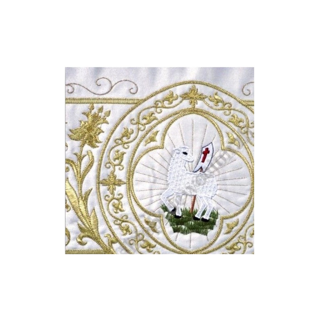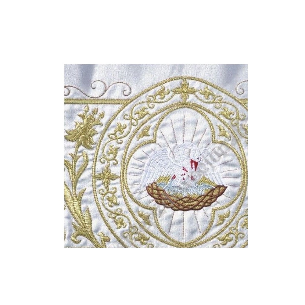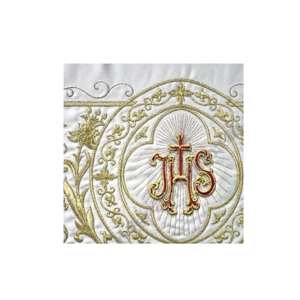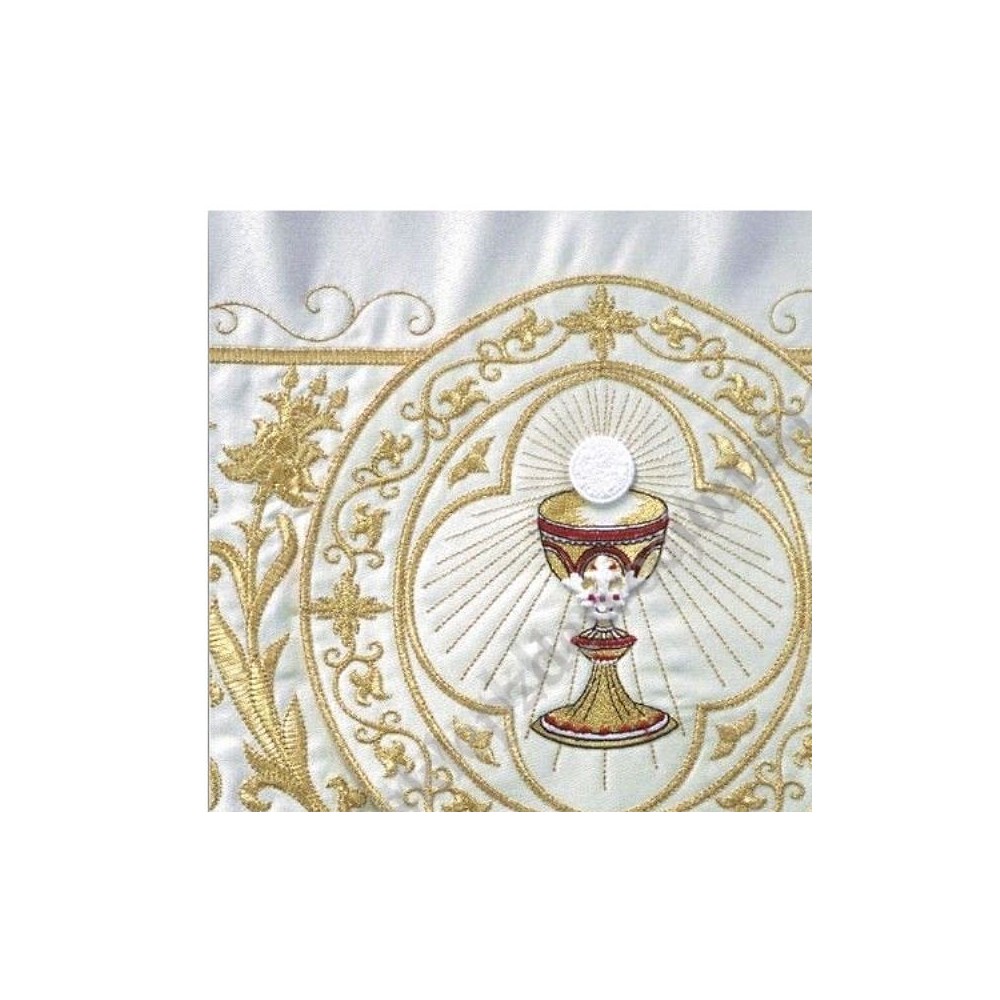 Baldachim liturgiczny wykonany z wysokiej jakości tkaniny satynowej, wykończony złotymi frędzlami. Na bokach haftowane symbole IHS, kielich eucharystyczny, Baranek Boży oraz pelikan; wszystko bogato zdobione haftowanymi motywami winogron i kłosów. Od wewnątrz na "niebie" symbol Ducha Świętego. Tkanina satyna nabłyszczana: 100%PE z apreturą plamoodporną. Rozmiar baldachimu: 130 cm x 160 cm. Baldachim bez usztywnienia, przygotowane są tunele pod usztywnienie, baldachim bez drzewców, drzewce na zdjęciu nie podlegają ofercie.