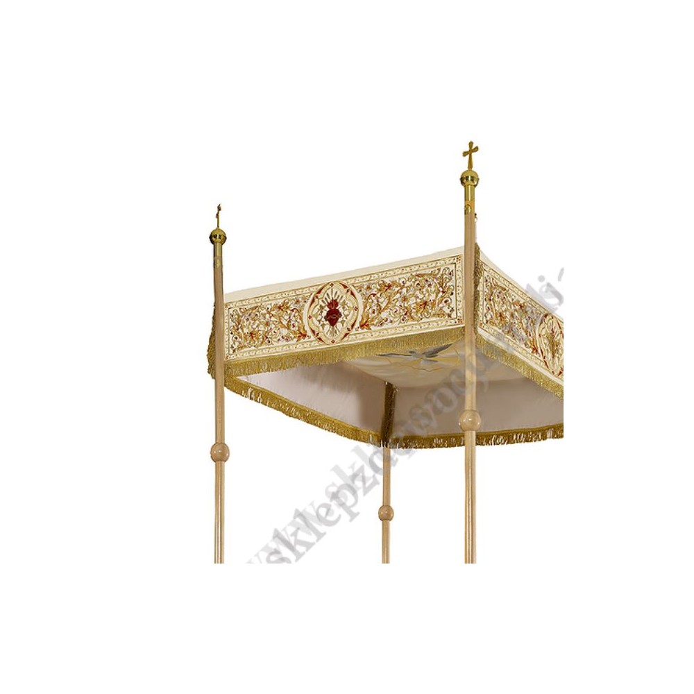 Baldachim liturgiczny w wymiarze 140 cm x 160 cm wykonany z wysokiej jakości tkaniny satynowej, wykończony złotymi frędzlami. BALDACHIM BEZ USZTYWNIENIA I BEZ DRZEWCÓW, DRZEWCE NA ZDJĘCIU NIE PODLEGAJĄ OFERCIE.