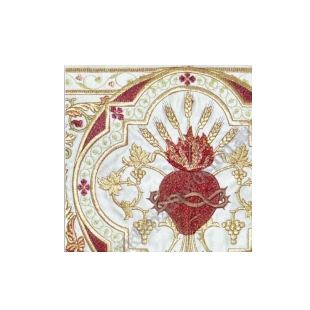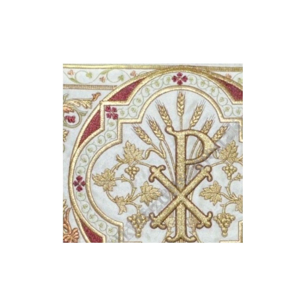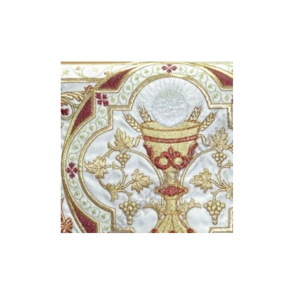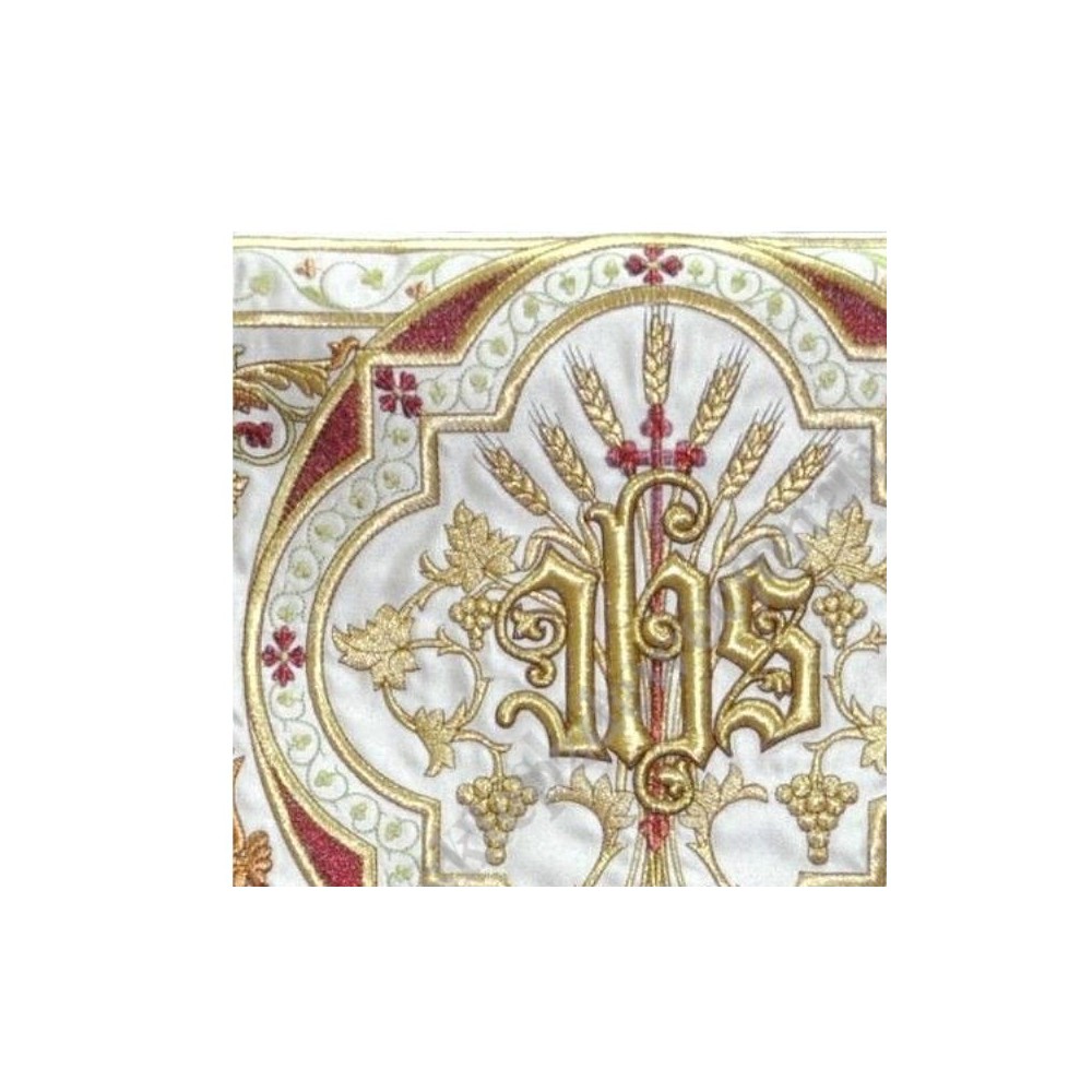 Baldachim liturgiczny wykonany z wysokiej jakości tkaniny satynowej, wykończony złotymi frędzlami. Na bokach haftowane symbole IHS, kielich eucharystyczny, Chi rho oraz serce Jezusa; wszystko bogato zdobione haftowanymi motywami. Od wewnątrz na "niebie" symbol Ducha Świętego. Tkanina satyna nabłyszczana: 100%PE z apreturą plamoodporną. Rozmiar baldachimu: 140 cm x 160 cm. Baldachim bez usztywnienia, przygotowane są tunele pod usztywnienie, baldachim bez drzewców, drzewce na zdjęciu nie podlegają ofercie.