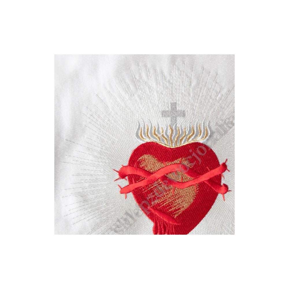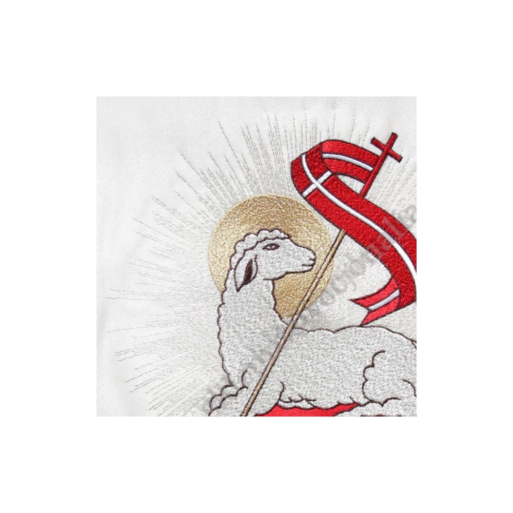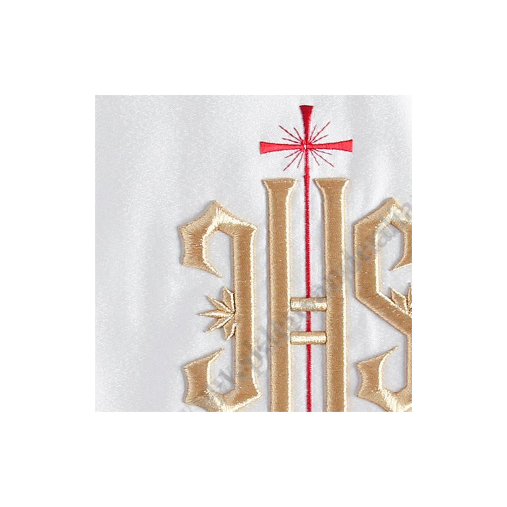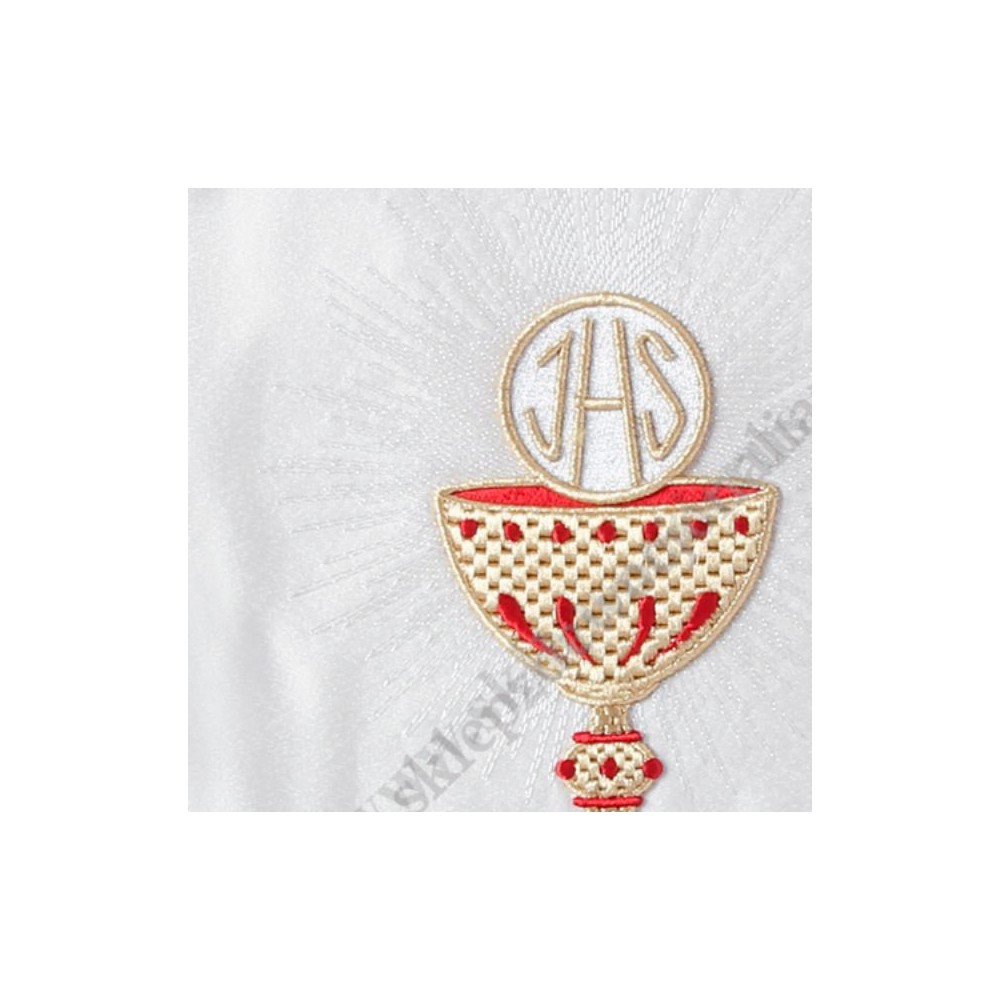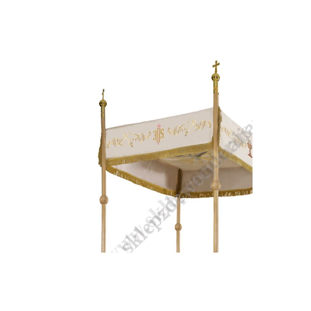 Baldachim liturgiczny wykonany z wysokiej jakości tkaniny satynowej, wykończony złotymi frędzlami. Na bokach haftowane symbole IHS, kielich eucharystyczny, Najświętsze Serce Pana Jezusa oraz Baranek Boży. Od wewnątrz na "niebie" symbol Ducha Świętego. Tkanina satyna nabłyszczana: 100%PE z apreturą plamoodporną. Rozmiar baldachimu: 140 cm x 160 cm. Baldachim bez usztywnienia, przygotowane są tunele pod usztywnienie, baldachim bez drzewców, drzewce na zdjęciu nie podlegają ofercie.