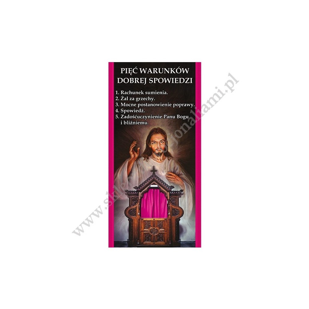 Katechetyczna dekoracja, pomoc katechetyczna przedstawiająca Pięć Warunków Dobrej Spowiedzi w postaci banera wydrukowanego w wysokiej rozdzielczości na bardzo dobrej jakości materiale odpornym na wszelkie warunki atmosferyczne.