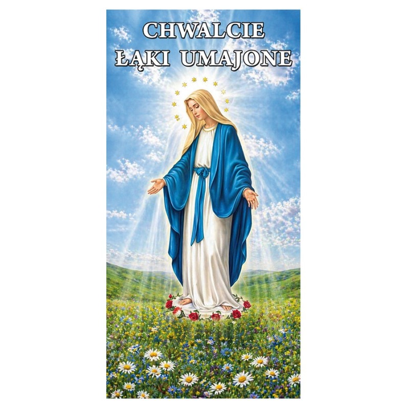 Dekoracja maryjna na Nabożeństwo Majowe w postaci banera wydrukowanego w wysokiej rozdzielczości na bardzo dobrej jakości materiale odpornym na wszelkie warunki atmosferyczne.